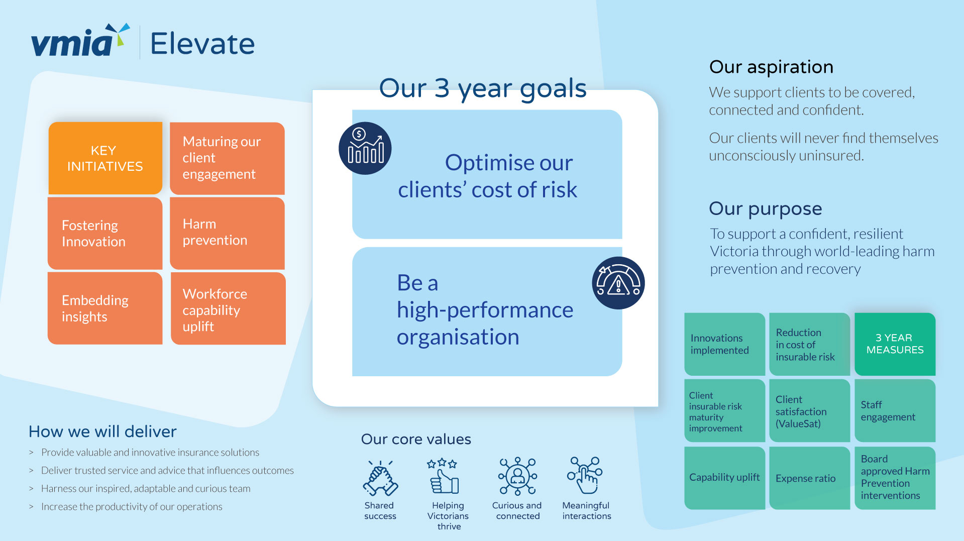 The current strategy Elevate builds on the achievements of Strategy 2024 to enable us to create further value for our clients. Our purpose remains the same - to support a confident, resilient Victoria through world-leading harm prevention and recovery.