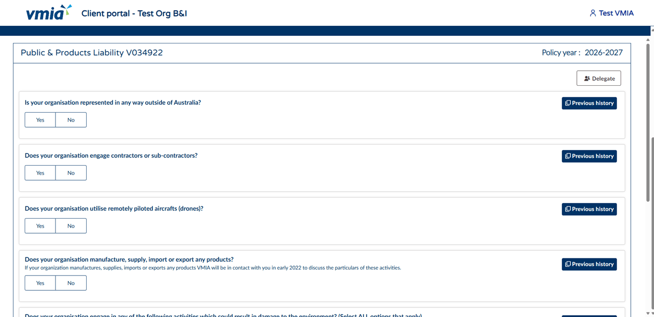 Providing accurate and updated information enables VMIA and its reinsurers to identify any changes in an organisation’s operations, assets, and potential hazards that might affect coverage, allowing for adjustments as required for adequate protection and compliance. Each client’s RRI questionnaire will vary and reflects their respective and active policies including key risk information required to be updated.